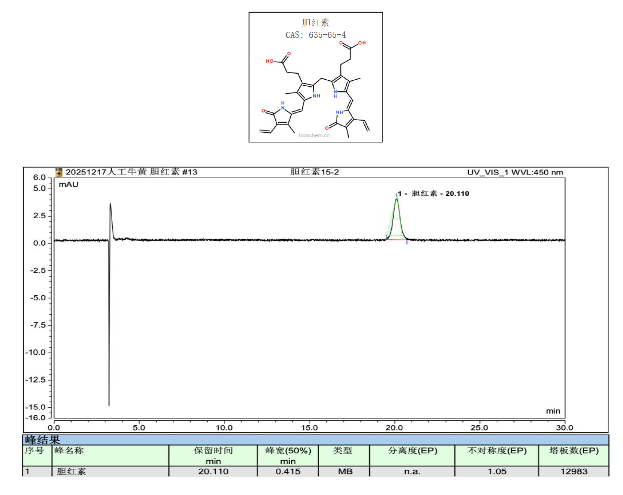 App ID: FLM-T250006 Titank C18 對(duì)人工牛黃中膽紅素含量測(cè)定 方法:中國(guó)藥典2025 一部 色譜柱:Titank C18 5μ 250×4.6mm (貨號(hào):FMG-5560-EONU) 流動(dòng)相:乙腈:1%冰醋酸溶液=95 : 5 流速:1mL/min 檢測(cè):UV 450nm 溫度:25℃ 樣品濃度:2mg/mL(藥典規(guī)定) 進(jìn)樣量:5uL 標(biāo)準(zhǔn)品色譜圖: ![]() |